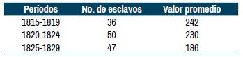 Si se desagrega la información contenida en esta gráfica, se observa que, durante los años más intensos de la lucha independentista, la baja en los precios se hizo más notoria. Asimismo, por esta época se volvió más usual encontrar esclavos en edad adulta y económicamente productivos con valores que se movieron entre 50 y 80 pesos, lo cual fue muy raro hallar durante el siglo XVIII cuando los promedios para ese rango de edad oscilaron casi invariablemente entre los 180 y los 220 pesos.