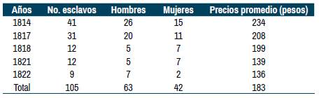 En materia de género, las cifras denotan una mayor preferencia de las mujeres a la hora de finiquitar transacciones comerciales, pues en el lapso de tiempo comprendido entre 1815 y 1824 se negociaron 52 hombres frente a 81 mujeres. Tal como anota el profesor Romero Jaramillo, este mayor número de mujeres transadas revela la importancia de ellas en la economía doméstica urbana, además del hecho de que su posesión garantizaba a los amos la posibilidad de incrementar su capital con los hijos que ellas procrearan (Romero-Jaramillo, 2009, p. 124).