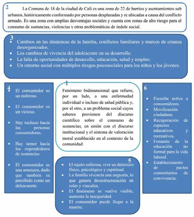 El consumo de sustancias psicoactivas es un fenómeno conocido, sea por su referencia obligada como problema de la sociedad moderna, o por su perenne presencia inmediata al contexto barrial de la ciudad de Cali. Emerge como una situación compleja y llena de significados desde la mirada sintética y experiencial de líderes comunitarios que han vivido con este 'problema' desde antes. En síntesis, hay un conocimiento diverso y un poco conflictivo sobre el abuso y la dependencia de drogas psicoactivas en relación a la afectación social e individual; así como una meridiana identidad con el papel de la comunidad y el Estado. En el presente estudio se lograron identificar tres conceptos que albergan los conocimientos de los participantes sobre el consumo de sustancias psicoactivas: a. El consumo de sustancias como un problema de salud; b. El consumo de sustancias como un problema social y; c. Las explicaciones sobre el consumo de sustancias, sus causas y efectos.