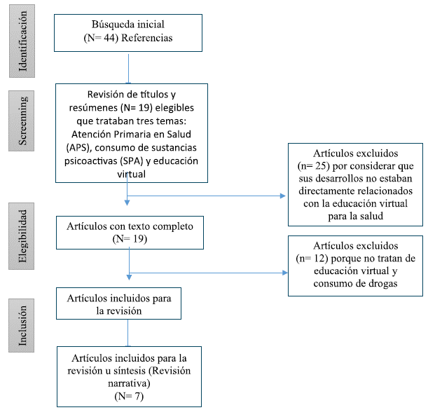 Con la lectura de los resúmenes y palabras clave se excluyeron 25 fuentes por considerar que sus desarrollos no estaban directamente relacionados con la educación virtual para la salud en adicciones. Al hacer una lectura de las 19 fuentes restantes y en una revisión inicial se encontraron tres categorías principales: Atención Primaria en Salud (APS), consumo de sustancias psicoactivas (SPA) y educación virtual; algunos artículos relacionan solo una o dos de ellas, por esta razón se excluyeron 12.