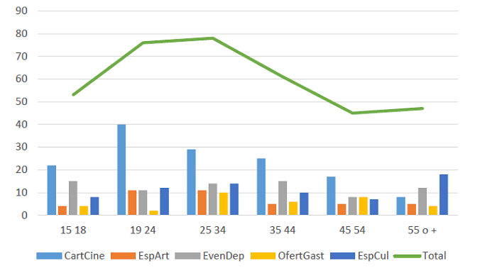 Como complemento de los datos arriba presentados, en la figura 2 es posible reconocer la forma en que las alternativas para el entretenimiento caracterizan preferencias diversificadas entre los ciudadanos, una experiencia que permite destacar que son los públicos que se ubican entre los 19 y 44 años de edad, quienes más disfrutan de lo que se ofrece en esta zona conurbada. Es de destacar el lugar que en las prácticas ocupa el consumo cinematográfico en casi todas las edades, a excepción de aquellos que se ubican por encima de los 55 años, entre quienes los espectáculos culturales y la asistencia a eventos deportivos llevan a dejar en un tercer sitio el consumo cinematográfico.