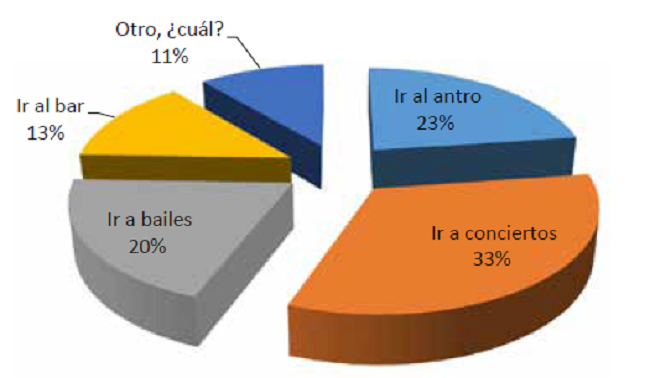 Aquí resulta interesante ver que asistir a museos se encuentra en primer lugar con 43%, en tanto que la asistencia a exposiciones fotográficas se muestra con 25%, para que presenciar una obra teatral sea 15%, mientras que los festivales artísticos 11% y las exposiciones de pintura 6%.5
