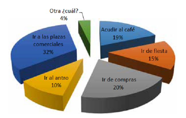 En la misma tesitura, como parte de sus prácticas y hábitos, se les preguntó a los sujetos de esta investigación aquellas actividades sociales que mayormente realizan en su vida cotidiana. En la figura 4, se puede reconocer que asistir a las plazas comerciales ha pasado a ser una experiencia importante (32%), en tanto que ir de compras (20%) y acudir al café (10%) son actividades que completan la configuración de las experiencias sociales de los ciudadanos habitantes de la conurbación Veracruz, Boca del Río y Medellín.