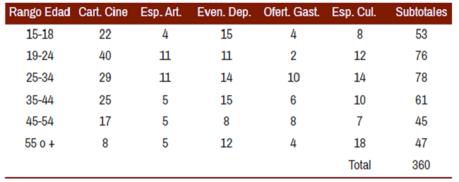 Al presentar estos datos integrados en una tabla de frecuencias, los resultados relacionados con oferta y consumo cultural, la variable “Rango de edad” frente a las “Opciones de entretenimiento” (ver Tabla 1), se observa el comportamiento entre los diversos públicos, en los que contrasta el lugar que ocupa en las prácticas ciudadanas cierto tipo de diversión, así como el papel que juegan las edades en ese tipo de experiencias.