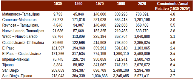 Pareciera que la frontera entre ambos países tendería a cierta difuminación, al menos en términos económicos, a pesar de las restrictivas leyes anteriormente comentadas y de la geografía del territorio. En este sentido, y como ilustración del creciente desarrollo de dichas áreas binacionales, así como de la atracción de migrantes (internos y externos), véase el incremento poblacional de los municipios y condados limítrofes, así como previsiones proyectadas (ver tabla 1):