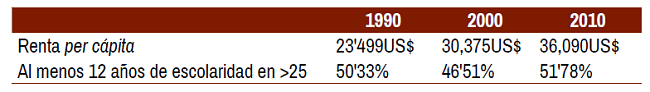 Esta tendencia revela dos cuestiones más. Por un lado, se trata de la mayor diferencia de renta entre ciudades en la frontera México-Estados Unidos. Por otro lado, desde comienzos de los años 90, dicha brecha, a diferencia de las otras áreas fronterizas, ha tendido a acrecentarse, con peor desempeño incluso que las medias nacionales entre Estados Unidos y México (Gerber, 2014, pp. 8-9). Es decir, no solo no habría convergencia entre ambas ciudades, sino que el desempeño de Tijuana sería relativamente pobre en relación con sus pares fronterizas del lado mexicano, aunque cuente con una renta per cápita mayor que la media nacional, superando eso sí, un largo período de estancamiento previo a los años noventa (Clement & Miramontes, 1993, p. 58). Véase a modo de ejemplo la tabla 2: