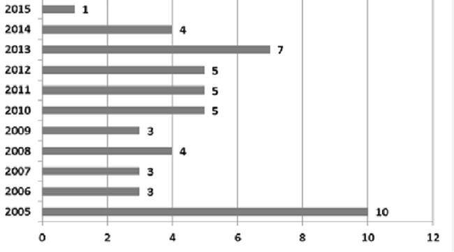 Las publicaciones fueron originadas en 12 países, sobresaliendo Argentina (n=15; 30%), México (n=10; 20%), España (n=6; 12%) Chile (n=5; 10%) y Colombia (n=4; 8%), entre los cuales suman el 80% de las producciones revisadas, mientras que en menor medida se encontraron artículos con firmas de instituciones provenientes de Estados Unidos (n=2; 4%), Cuba (n=1; 2%), Uruguay (n=1; 2%) y Brasil (n=1; 2%). También se identificaron producciones filiadas a países europeos como Francia (n=2; 4%) e Italia (n=1; 2%), pero cuyos autores son latinoamericanos residentes en esas naciones; finalmente, se identificaron dos autores de Portugal (n=2; 4%) cuyo tema de análisis estuvo centrado en exilios latinoamericanos. La distribución de estas producciones de acuerdo con el año de publicación es variable, sin que se observe una clara tendencia aunque en el último quinquenio (2010-2014) hay menos variabilidad (Figura 1).