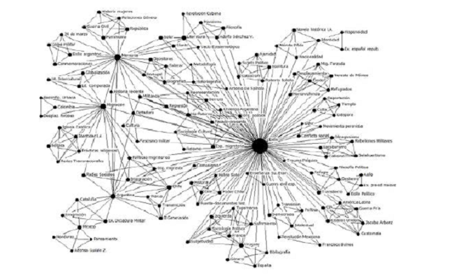 Finalmente, a partir de las palabras clave de los artículos revisados, se construyó una red social (Figura 3) para visualizar las relaciones definidas entre dichos términos, lo cual permitió identificar cuáles son los conceptos que comúnmente se vinculan con el estudio del exilio, así como la construcción de subconjuntos temáticos que pueden definir los escenarios de investigación más usuales en este campo de análisis.