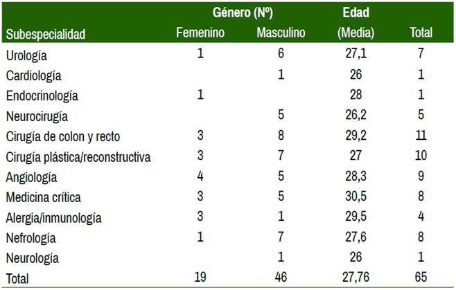 Se evaluaron 65 candidatos a subespecialidad médica, la mayoría de género masculino, con edad promedio de 27,7 años (Tabla 1).