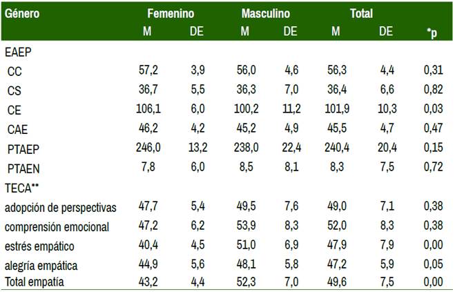 El puntaje promedio global y para cada competencia en la EAEP califica como óptimo, y en el TECA como media. Al comparar los valores por género, en la EAEP las mujeres obtienen un puntaje mayor que los hombres en competencias éticas (106,1 vs 100,2, p = 0,03); y en el TECA las mujeres califican con empatía global baja a expensas de estrés empático y alegría empática: 43,2 vs 52,3; 40,4 vs 51 y 44,9 vs 48,1, respectivamente, p < 0,05 (Tabla 2).