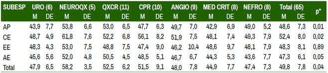 La comparación de actitudes éticas profesionales entre las distintas subespecialidades no mostró diferencias significativas, pero sí en los puntajes de empatía en algunas áreas (Tabla 3): los residentes candidatos a urología y medicina crítica obtuvieron promedios bajos en adopción de perspectivas (43,9 y 42.9, p = 0,01) y también en alegría empática los de medicina crítica (44,3, p = 0,02); los residentes de nefrología presentaron promedio bajo para alegría empática (43,6, p= 0,05); los residentes candidatos a cirugía plástica y reconstructiva obtuvieron promedio alto en comprensión emocional (56,1 y 51,5, p = 0,04); y los candidatos a neurocirugía promedio alto en comprensión emocional y empatía global (61,8 y 58,2, p < 0,05).