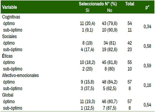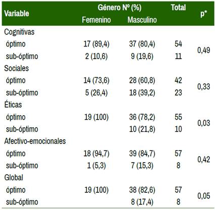 La comparación por género del nivel (óptimo/sub-óptimo) en la EAEP (Tabla 4) mostró que una proporción mayor de mujeres presenta competencias éticas óptimas y puntaje global óptimo (100% vs 78% y 100% vs 82%, respectivamente, p < 0,05).