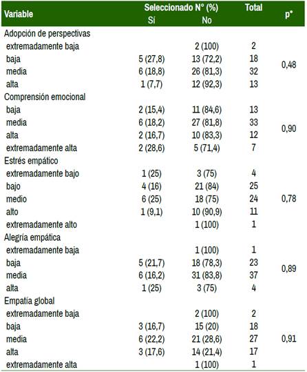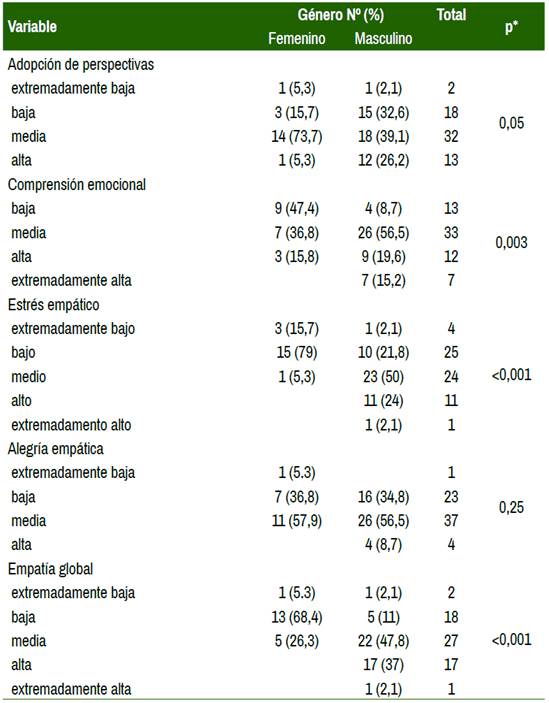 En el TECA, los hombres tuvieron mayor proporción de calificación alta en adopción de perspectivas (p = 0,05), y alta y extremadamente alta en comprensión emocional (p = 0,003); en las mujeres se observó mayor porcentaje de calificación baja en estrés empático y empatía global (p < 0,001), como se muestra en la Tabla 5.