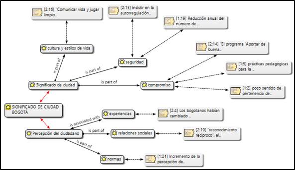 Dentro de la percepción del ciudadano, código asociado en la Figura 2, se relacionan narrativas ligadas con las experiencias, en términos de la confianza depositada por los bogotanos en las buenas prácticas de gobernanza [2:4], las relaciones sociales con el reconocimiento reciproco [2:19] y el incremento de la percepción de los derechos como derechos y no como favores y el nivel de confianza en los procedimientos democráticos [21], es así como a través de: "La armonización entre lo moralmente válido para el individuo, lo culturalmente aprobado por la colectividad y lo legalmente permitido se afianzó las dimensiones legales, morales y culturales de la vida" (Mockus, 1995, p. 8).