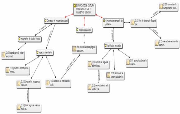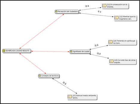 Desde la compresión sociológica y del marketing urbano con respecto al significado de ciudad, en la Figura 2 se establecieron dos códigos principales: a) percepción del ciudadano, determinado a través de un plan de gobierno incluyente [1:1] y ciudadanos bogotanos más sensibles a las necesidades del más desfavorecido [1:2]. Con referencia al código significado de ciudad, sobresale en la revisión de la literatura la asociación con las obras arquitectónicas como atributos positivos de la ciudad, tales como la ruta de peregrinaje a Monserrate y el eje ambiental de Bogotá [1:5], así como en términos de lo que representó el territorio como código, la preocupación por el cuidado del medio ambiente y el uso del suelo [1:3].