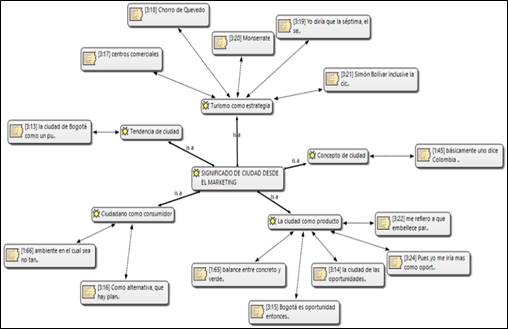 En línea con lo anterior, en la Figura 4 se puede observar el significado de ciudad (desde una mirada del marketing urbano) que ha ido construyendo el joven bogotano, ya que se encontró asociado con códigos como el turismo como estrategia, que contiene cinco narrativas principales: centros comerciales [3:17], Chorro de Quevedo [3:18], Monserrate [3:20], la séptima [3:19] y el Parque Simón Bolívar [3:21], entre los sitios más emblemáticos de la ciudad. Desde la óptica de la ciudad como producto, Bogotá se asocia con códigos y narrativas ligadas con la ciudad de las oportunidades [3:14] y con un balance entre concreto y verde [1:65].