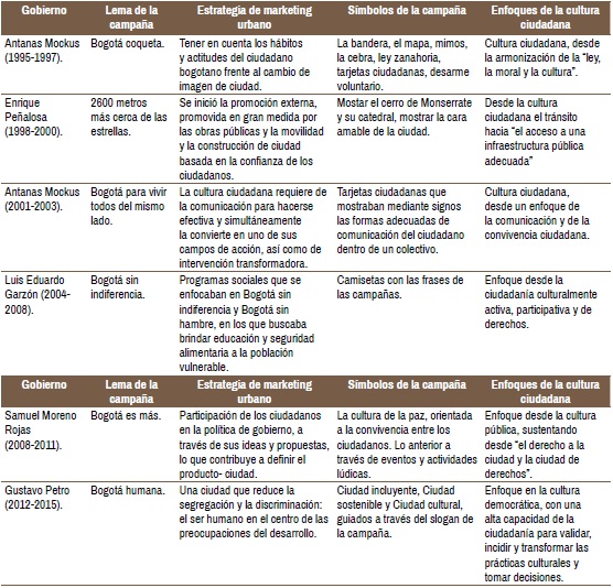 Duque-Franco (2011) hizo un análisis retrospectivo de las campañas de los gobiernos distritales desde 1999 hasta el año 2011 (Mockus -ambos periodos-, Peñalosa, Garzón, Moreno y Petro), destacando el papel del marketing urbano como instrumento de gestión y planificación con el objetivo de responder a las necesidades de inversión, turismo y empresa, mediado por los aspectos intrínsecos de la cultura ciudadana, teniendo en cuenta dos ejes: a) enfoque de promoción interna desde las diferentes administraciones y b) enfoque de promoción externa para el fortalecimiento de la competitividad entre ciudades. A partir de lo anterior, se infiere que el marketing urbano trasciende la construcción de una marca ciudad y del diseño de campañas publicitarias, en este sentido es relevante atender a las necesidades del ciudadano y a la identificación de aspectos culturales subyacentes.