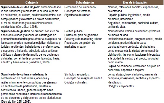 En la Figura 1 se evidencia lo anterior, conceptualizado a partir de dos categorías principales: a) el significado de ciudad y b) la percepción del ciudadano, visto en la Bogotá coqueta del primer gobierno de Mockus (1995-1997) y en Bogotá. Todos para vivir del mismo lado del segundo periodo (2001-2003).
