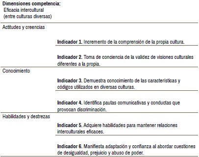 Seguidamente, en la fase de intervención, se procedió a aplicar una encuesta diseñada por Cano y Ricardo (2014) a partir de lo expuesto por Aguado (2003). De esta encuesta sólo se aplicó el componente que busca medir la competencia "eficacia intercultural" de los estudiantes por medio de 16 preguntas elaboradas a la luz de tres dimensiones y seis indicadores, los cuales son descritos en la Tabla 1.