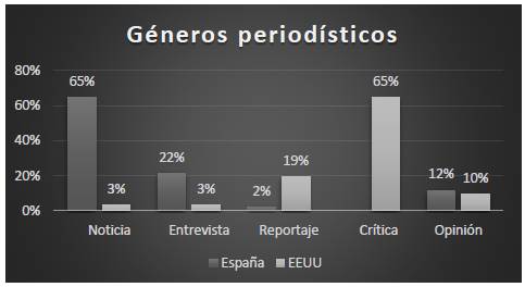 La noticia es el género más utilizado por los medios españoles para cubrir el tema de la serie Narcos en sus portales digitales. Un 65% de las publicaciones de los medios son basadas en este género que es entendido por Tuchman (1978/1983) como resultado de una construcción de la opinión pública ante las tendencias sociales. "La noticia se está definiendo y redefiniendo, constituyendo y reconstituyendo permanentemente en fenómenos sociales" (Tuchman, 1978/1983, p. 198). Es decir, las noticias resultan de las indagaciones periodísticas como respuesta a las tendencias televisivas que plataformas como Netflix ayudan a generar en los consumidores.