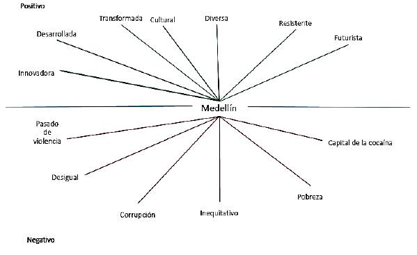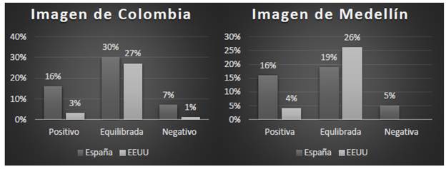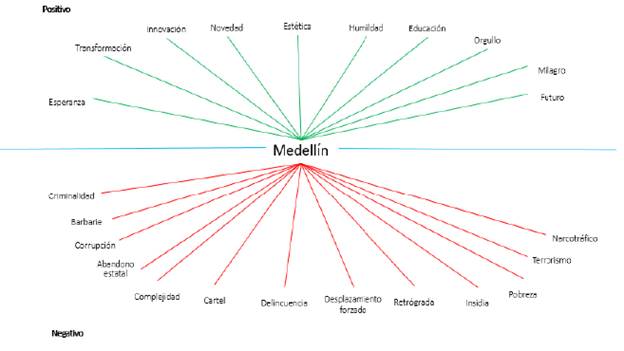 La imagen de Medellín en los medios de comunicación española es neutra en un 48%. En contraste, el 40% es una imagen positiva y un 13% representa la información negativa en los contenidos en los medios. Cabe resaltar que los conceptos negativos de la ciudad están marcados por temporalidades entre el accionar delictivo del Cartel de Medellín y la progresiva transformación positiva de la ciudad reflejada en la baja de índice de homicidios y la neutralización de históricos narcotraficantes luego de la muerte del capo. Respondiendo a los criterios de estos géneros, la imagen de Medellín se ha elaborado a partir de una serie de conceptos referenciados a continuación.