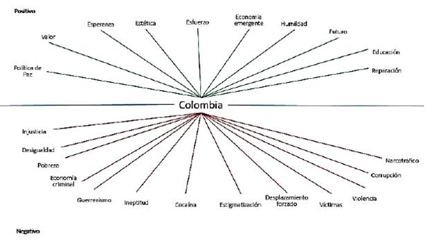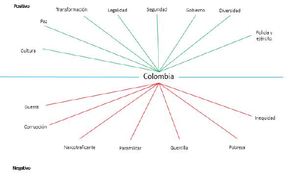 La imagen de Colombia tiene una variación diferente. El 57% de los contenidos expresan una percepción equilibrada o neutra, mientras que el 30% es positivo. La mezcla entre corrupción, diversidad y cultura cafetera dominan el mapa de conceptos y adjetivos usados por los diarios para identificar el país. Echeverri, Estay-Niculcar & Parra (2014), afirman que la imagen de Colombia se diferencia entre quienes conocen su realidad de primera mano y quienes construyen la imagen del país a partir de los medios de comunicación. A continuación, se muestra la distribución de dichos conceptos (ver figura 9).