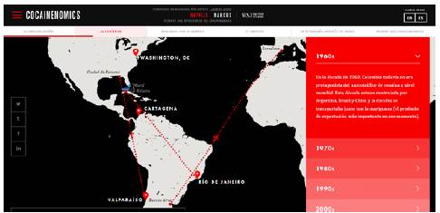 Por otro lado, The Wall Street Journal crea, en asocio con Netflix, una página web dedicada al análisis de los negocios del Cartel de Medellín y sus aliados para el envío de cocaína a los Estados Unidos y Europa. Cocainenomics, disponible en español e inglés, es un conjunto de infografías animadas. Una herramienta virtual para que el internauta señale, por décadas, los hechos y lugares más relevantes alrededor de la producción, distribución y consumo de cocaína. Ciudades como Río de Janeiro -Brasil-, Buenaventura -Colombia-, Valparaíso -Chile-, Tampico -México- y Cartagena -Colombia- conforman una extensa red de narcotráfico que trasciende la frontera de la ubicación del cartel en Medellín, Colombia.