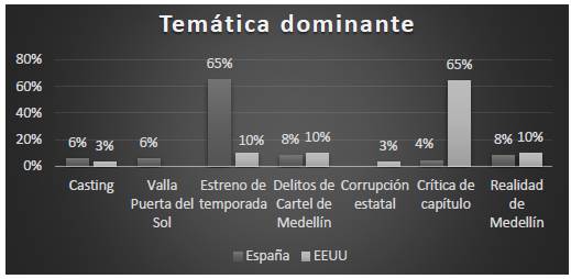 La crítica profesional de los capítulos de estreno es el tema más manejado por los periodistas de The New York Times en un 65%. Como fue explicado en el capítulo de géneros periodísticos, los dos principales productores de información relacionada con la serie son Genzlinger (2015b) y Tobias (2015). La temática de The New York Times estaría más relacionada a la lectura textual de la serie, frente a un análisis comparativo que es desarrollado por The Wall Street Journal en su sección Cocainenomics. Los delitos del cartel -10%- y la realidad de Medellín -10%- están relacionados con lo desarrollado en el capítulo Imagen de Colombia e Imagen de Medellín. Ambos periódicos relacionan lo ocurrido en la serie, con las acciones del Cartel en la ciudad de Medellín.