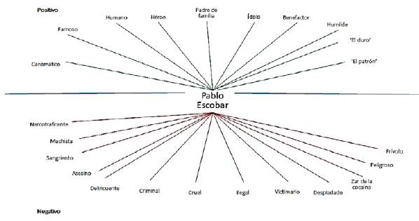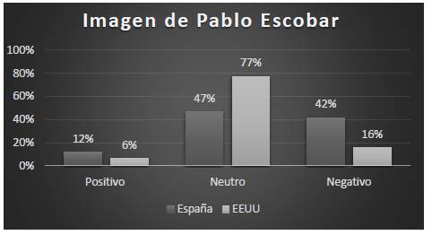 La imagen de Pablo Escobar en los medios de comunicación española es neutra con un 47%. Sin embargo, el 42% de la percepción de la imagen resultó negativa. Recurriendo a las palabras más usadas para calificar al personaje, se logra identificar la percepción de los periodistas y de los medios indagado s, analizando los textos de opinión. Es importante resaltar que muchas de ellas consolidan imaginarios construidos por diferentes fuentes de consulta de los periodistas, es decir, hay un trabajo que desarrolla la dualidad de Escobar como figura pública admirada y temida por diferentes sectores de la población.
