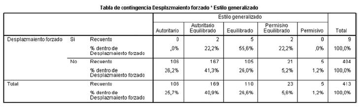 En esta investigación llamó la atención la información resultante del grupo de participantes que se identificaron como "desplazados por la violencia", pues de los 9 estudiantes, 5 perciben PEF equilibradas (55,6%), 2 estudiantes la reportan como permisivas equilibradas (22,2%) y 2 estudiantes como autoritarias equilibradas (22,2%) (Tabla 10). Ninguno de los encuestados reportó PEF autoritarias o permisivas. Aunque este grupo es pequeño para hacer una generalización sobre la población de desplazados en otros colegios o áreas geográficas colombianas, sería preciso estudiar si esta tendencia se mantiene y por qué; ya que el sentido común indicaría que por su génesis de violencia las PEF deberían ser autoritarias o permisivas, pero en contra de esta opinión se percibe una ruptura de la familia con su legado violento y una necesidad de educar desde otras lógicas y tonalidades, más humanas y dialógicas.