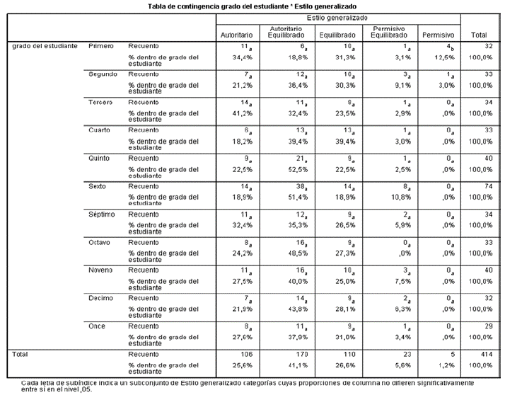 En la tabla de contingencia para las variables "curso" y "práctica educativa", se halló que los estudiantes del grado primero (34,4%) y tercero (41,2%) reportan PEF autoritarias, mientras segundo (36,4%), cuarto 39,4%, quinto (52,5%), sexto (51,4%), séptimo (35,3%), octavo (48,5%), noveno (40%), decimo (43,8%) y once (37,9%) PEF autoritarias equilibradas (Tabla 11). En este grupo se halló el dato de 5 niños de primaria que reportaron PEF permisivas. De acuerdo con estas cifras, primaria es el espacio educativo en que mayor cantidad de PEF autoritarias se reportan, mientras que en secundaria la tendencia es hacia PEF autoritarias equilibradas.
