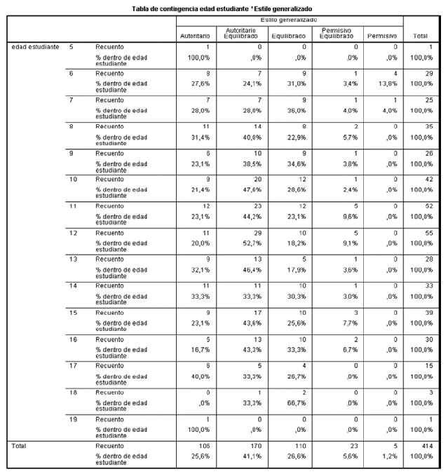 En el caso del cruce entre las variables "edad" con "práctica educativa" se halló que los jóvenes con edades de 14 (33,3%), 17 (40,0%) y 19 (100%) años reportan las PEF como autoritarias, mientras que aquellos de 8 (40,0%), 9 (38,5%), 10 (47,6%), 11 (44,2%), 12 (52,7%), 13 (46,4%), 15 (43,6%), 16 (43,3%) y 18 (66,7%) revelaron prácticas autoritarias equilibradas, y los niños de 6 (31,0%) y 7 (36,0) años reportaron prácticas equilibradas (Tabla 12). De acuerdo con lo anterior, las PEF tienden a ser más equilibradas en las edades más tempranas, pero más autoritarias en edades como los 14, 17 y 19 años.