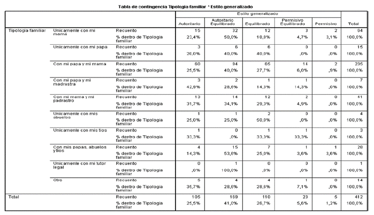 La tabla de contingencia correspondiente a la "tipología familiar" y "práctica educativa" indica que la tipología familiar con mayor frecuencia de prácticas educativas autoritarias es aquella conformada solo por los tíos, es decir, por la familia consanguínea sin presencia de los padres (33,3%) y por las familias nucleares recompuestas con presencia de madrastra (42,9%). Las tipologías familiares en las que se reportan PEF autoritarias equilibradas son las familias monoparen-tales de jefatura femenina (50,0%), las familias monoparentales de jefatura masculina (40,0%), las familias nucleares (40,0%), las familias recompuestas por presencia de padrastro (34,1%) y la familia extensa y nuclear que cohabita (53,6%). Un encuestado reportó que en su familia consanguínea conformada solo por los abuelos, las PEF son equilibradas (50,0%), lo que contrasta con un encuestado que no vive con sus padres o parentela, ya que él reporta una práctica 100% autoritaria (Tabla 13). Queda claro que en las tipologías familiares en las que hay mayor presencia de prácticas autoritarias son en las que no está presente alguno de los padres o no está ninguno. Resalta el hecho de que el contexto familiar en el que mayor cantidad de reportes de PEF autoritarias equilibradas es la familia monoparental de jefatura femenina y que el único contexto familiar equilibrado es la familia consanguínea conformada solo por abuelos, sin presencia de los padres del niño.
