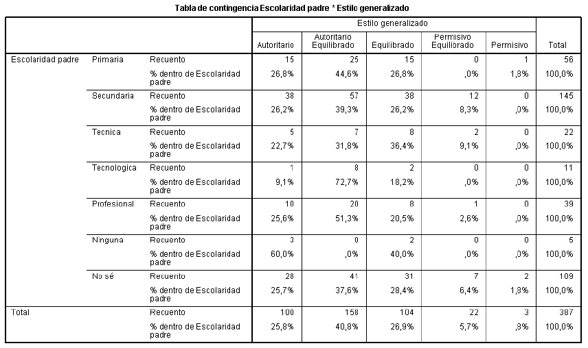 En relación con el cruce entre "escolaridad" del padre o la madre con la "práctica educativa" se encontró que entre mayor es el nivel de formación, más común es la PEF autoritaria equilibrada. Por ejemplo, los padres con nivel de formación tecnológica y profesional presentan porcentajes de 72,7% y de 51,3% de las PEF autoritarias equilibradas (Tabla 14). En el caso de lo que se encontró sobre las madres se evidencia un aumento de la PEF autoritaria equilibrada conforme aumenta su nivel de formación: primaria (38,1%), secundaria (42,5%), técnica (47,5%), tecnológica (42,9%) y profesional (57,6%) (Tabla 15).
