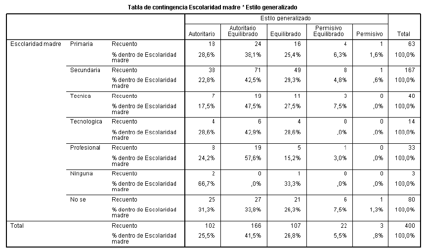Otros dos hallazgos significativos e igualmente novedosos, se relacionan primero, con el hecho de que la familia en la que más se presentan prácticas autoritarias son aquellas en las que solo hay presencia de uno de los padres, y particularmente en las familias monoparentales de jefatura femenina; y, segundo, que el nivel de escolaridad de los padres influye en la PEF, es decir, que entre mayor sea el nivel de formación de los padres mayor tendencia tendrá la PEF a ser autoritaria. Ambas situaciones por el grado de novedad del resultado y por los pocos datos empíricos que se poseen, deben ser estudiadas con profundidad; así las cosas, no se podría realizar ninguna aseveración científica, por lo que las hipótesis podrían ser muy aventuradas teniendo en cuenta que el contexto del estudio solo refleja una sola localidad de Bogotá.