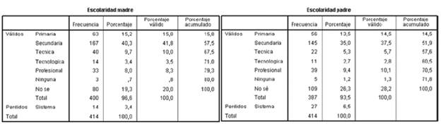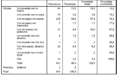 El análisis estadístico de la muestra aleatoria de 414 estudiantes tomada de un colegio oficial de la ciudad de Bogotá, Colombia, realizado mediante análisis de frecuencias y algunas tablas de contingencia (únicamente como medio para describir el cruce de algunas variables, sin detenernos en correlaciones, incidencias entre variables o independencia de las columnas), permitió comprender las percepciones de los niños y adolescentes sobre las PEF de sus padres o cuidadores, en relación con las variables sociodemográficas de su contexto en particular; un contexto social vulnerable en el que la generalidad son los estratos socioeconómicos bajos: 1, 2 y 3.