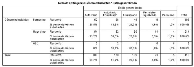 Según los resultados de las tablas de contingencia, al cruzar las variables "género" y "práctica educativa" se observó que el género femenino percibe mayores PEF autoritarias equilibradas (43,9%) en comparación al género masculino (38,3%). No obstante, el género masculino (28,0%) reportó mayor porcentaje de prácticas equilibradas que las mujeres (24,5%); lo que significaría que, en este contexto socioeducativo, las prácticas de formación familiar hacia las mujeres son más rígidas y arbitrarias que hacia los hombres. De los 3 participantes que informaron pertenecer a otro género o minoría sexual, 2 percibieron PEF autoritarias equilibradas (66,7%) y el restante, equilibradas (33,3%) (Tabla 7).