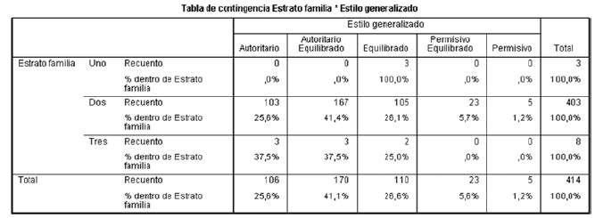 Respecto al cruce de las variables "estrato social" y "práctica educativa", como se había enunciado anteriormente, el estrato socioeconómico 2 es el de mayor frecuencia en la muestra. El 41,4% de los participantes de este estrato obtuvieron un resultado de PEF autoritaria equilibrada, seguida por un 26,1% correspondiente a la práctica equilibrada y a un 25,6% que reportaron PEF autoritarias (Tabla 8); lo que denota que la práctica educativa más común para el estrato 2 es la autoritaria equilibrada.