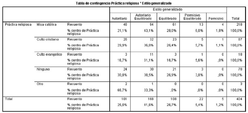 Otra variable sociodemográfica cruzada con la "práctica educativa" es la variable "religión". Entre los resultados se destaca que el grupo religioso con mayor porcentaje en la elección de PEF autoritaria equilibrada fue el correspondiente al culto evangélico (61,1%), mientras que el grupo católico reportó un 43,1% y el cristiano un 36,8% (Tabla 9).