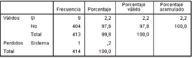 Los participantes informaron pertenecer a estratos sociales uno (0,7%), dos (97,3%) y tres (1,9%), siendo el estrato dos el de mayor presencia (Tabla 1); según la Subdirección de Información Sectorial de la Secretaría de Hábitat de la Alcaldía Mayor de Bogotá D.C, de la totalidad de predios residenciales de la Localidad de Bosa, el 9,8% pertenecen al estrato 1, 87,8% al estrato 2 y el 2,4% al estrato 3 (2015). De los 414 estudiantes, 9 de ellos afirmaron haber sido víctimas de desplazamiento forzado, esto representa en la muestra el 2.2% (Tabla 2). El 81,2% de los estudiantes afirmaron practicar algún tipo de religión: el 57,2% practican el catolicismo, el 25,3% culto cristiano-evangélico y el 0,2% otra religión, mientras que el 18,8% negaron practicar algún tipo de religión (Tabla 3).