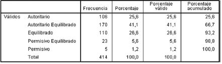 Las PEF se clasifican en tres grupos: autoritario, equilibrado y permisivo, de acuerdo con el nivel de afecto, control y comunicación generado en cada familia de los niños y adolescentes consultados. La consolidación de los resultados de la información indica que el 66,7% de la muestra lleva a cabo PEF autoritarias, mientras que el 26,8% son equilibradas y el 6,5% permisivas. El porcentaje acumulado indica que el 93,5% de la muestra presenta PEF entre autoritarias y equilibradas. Estos resultados revelan que no es posible encontrar una práctica educativa familiar "pura", sino más bien, la formación de una canasta de prácticas entre autoritarias y equilibradas, con mayor tendencia hacia la elección de autoritarias (Tabla 6).