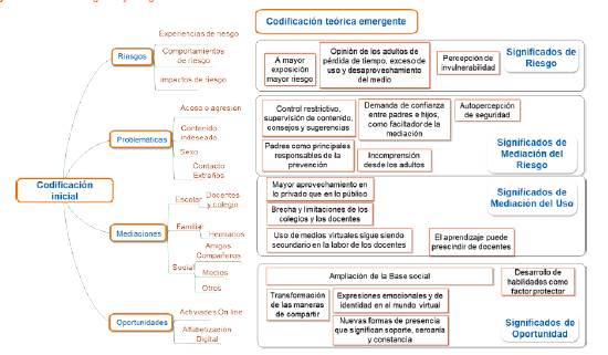 Para el análisis de la información se partió de la codificación utilizada en Europa (Global Kids online, 2016), diferenciando las dimensiones de dificultades/riesgos, de la de oportunidades y mediación, dando igual relevancia a cada una y ampliando algunas definiciones desde los hallazgos específicos de la primera codificación. Las definiciones de situaciones problema, personas y plataforma se conservaron.