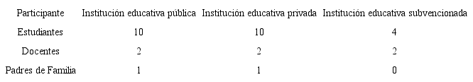 Con los jóvenes interesados se procedió a solicitar el consentimiento informado de los padres, incluyendo una pregunta por su voluntad de ser entrevistados. Al final de este procedimiento se obtuvieron 6 entrevistas a duplas, 3 de hombres y 3 de mujeres, 2 grupos de discusión, 6 entrevistas con 3 docentes considerados cercanos y 3 considerados lejanos por los mismos jóvenes, y 2 entrevistas a las madres de familia de los jóvenes de dos instituciones.