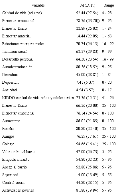 Con respecto a los resultados reportados por la comunidad del barrio La Cruz acerca de la calidad de vida se encontró que las subescalas de bienestar físico y bienestar material obtuvieron puntuaciones bajas dentro del rango, esto coincide con lo esperado puesto que la muestra se ubica en estratos socioeconómicos bajos. Sin embargo, se resaltan las puntuaciones altas en las subescalas de bienestar emocional, relaciones interpersonales, y autodeterminación para el caso de los adultos y puntuaciones medias en derechos, inclusión social y desarrollo personal. En el caso de los niños para la calidad de vida, se encontraron puntuaciones altas dentro del rango en las subescalas familia, autoestima, amigos, bienestar emocional, de forma similar, se obtuvieron puntuaciones medias dentro del rango para bienestar físico y colegio. En la ansiedad y depresión se encontraron puntuaciones bajas dentro del rango. Por su parte, en las subescalas de empoderamiento, apego y control social, se obtuvieron puntuaciones medias dentro del rango, mientras que en actividades para la comunidad se encontró puntuación alta dentro del rango (tabla 1).