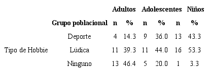 Con respecto a los pasatiempos, se encontró que el 36% de los adolescentes practican un deporte. En esta categoría se agruparon las respuestas tales como “jugar futbol” o “patinar”. Con respecto a las actividades lúdicas, tales como “ver televisión”, “jugar”, “leer”, “estudiar” o “chatear” se encontró que estas actividades son el pasatiempo más practicado por los niños (53.3% de los niños las realizan). Finalmente, se encontró que un 46.4% de los adultos no tiene ningún pasatiempo (tabla 2).