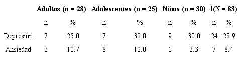 Con relación a la salud mental, al tomar los puntos de corte sugeridos para el PHQ-9 y el GAD-7, se encontró que el 8.4% (n = 7) presentan síntomas de ansiedad clínicamente significativos, mientras que un 28.9% (n = 24) presentan síntomas de depresión clínicamente significativos. Es importante destacar que las cifras son similares en los tres grupos poblacionales (niños, adolescentes y adultos), pero se aclara que en los niños se presentan menores niveles de ansiedad (tabla 3).