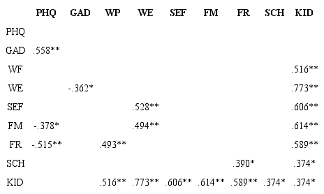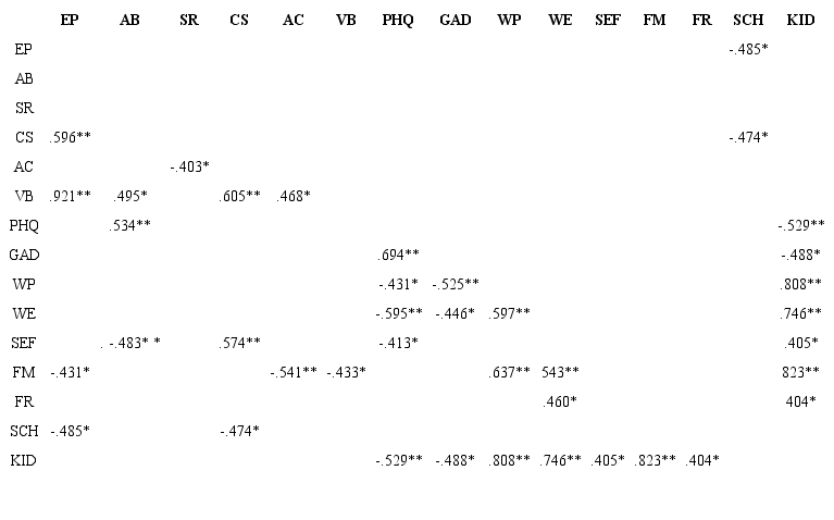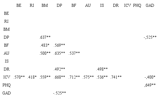 En los niños, se encontró relación directa de la depresión con la ansiedad (p < 0.01), e inversa, con la familia (p < 0.05) y amigos (p < 0.01). En cuanto a la ansiedad, se encontró una relación inversa con bienestar emocional (p < 0.05). Por su parte, el bienestar físico se relacionó directamente con los amigos p < 0.01), y el bienestar emocional, se relacionó directamente con la autoestima y la familia (p < 0.01 para ambos). Finalmente, se encontró relación entre amigos y escuela (p < 0.05) (tabla 6).