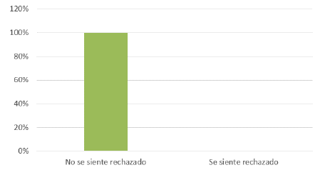 De acuerdo con la figura anterior, el 100 % de los estudiantes entrevistados expresaron que no se sienten rechazados dentro de la institución. Esto sucede por el trabajo constante sobre los valores y los principios institucionales que se realiza en este ambiente educativo, lo que resulta en un aprendizaje que los niños ponen en práctica en los diferentes contextos de convivencia. La ausencia de rechazo con respecto a las diferentes discapacidades de sus compañeros -y de los estudiantes que tienen algún tipo de discapacidad- permite que no se presenten peleas relacionadas con estas o burlas hacia ellos.