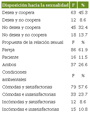 En cuanto a este ejercicio de la sexualidad, se dividió en tres rubros: 1) disposición hacia la sexualidad -en este se aprecia que el 45 % refirió desear y cooperar en el momento de la relación sexual, el 8.6 % deseaba la relación sexual y no cooperó, entretanto, el 32.4 % no deseaba y cooperaba, y en el rubro de no desea y no coopera se encuentra el 12.9 %-; 2) propuesta de la relación sexual -se encontró que el 70 % de las mujeres de la muestra refieren que la propuesta la hace su pareja, en tanto que el 26.6 % señala que esta corre por parte de ambos y solamente el 11.5 % de las mujeres proponen la relación-; 3) condiciones ambientales -en este rubro el 57 % menciona que al momento de la sexualidad las condiciones ambientales son cómodas y satisfactorias, el 27 % las califica como cómodas e insatisfactorias, en tanto que el 10.8 % dice que son incómodas e insatisfactorias y el 8.6 % menciona que a pesar de ser incómodas son satisfactorias- (véase Tabla 1).