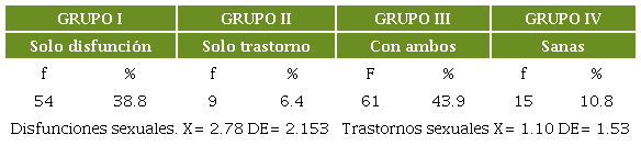 De acuerdo con la presencia de disfunciones y trastornos sexuales detectados en la Historia Codificada de la Sexualidad Femenina, la muestra se dividió en cuatro grupos. GRUPO I, conformado por aquellas mujeres que contaban con disfunción sexual (f=54), GRUPO II con trastorno sexual (f=9), GRUPO III con ambos problemas (f=61) y finalmente el GRUPO IV, aquellas pacientes que no presentaron ninguno de los dos problemas (f=15) (véase Tabla 3).